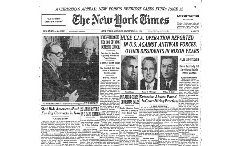 Created in response to explosive revelations of the U.S. Army’s program of domestic surveillance and an article published in the New York Times on December 22, 1974, by Seymour Hersh exposing assassination attempts on foreign officials by the Central Intelligence Agency (CIA), the committee launched a series of investigations into American intelligence agencies including the CIA, National Security Agency (NSA), and the Federal Bureau of Investigation (FBI).